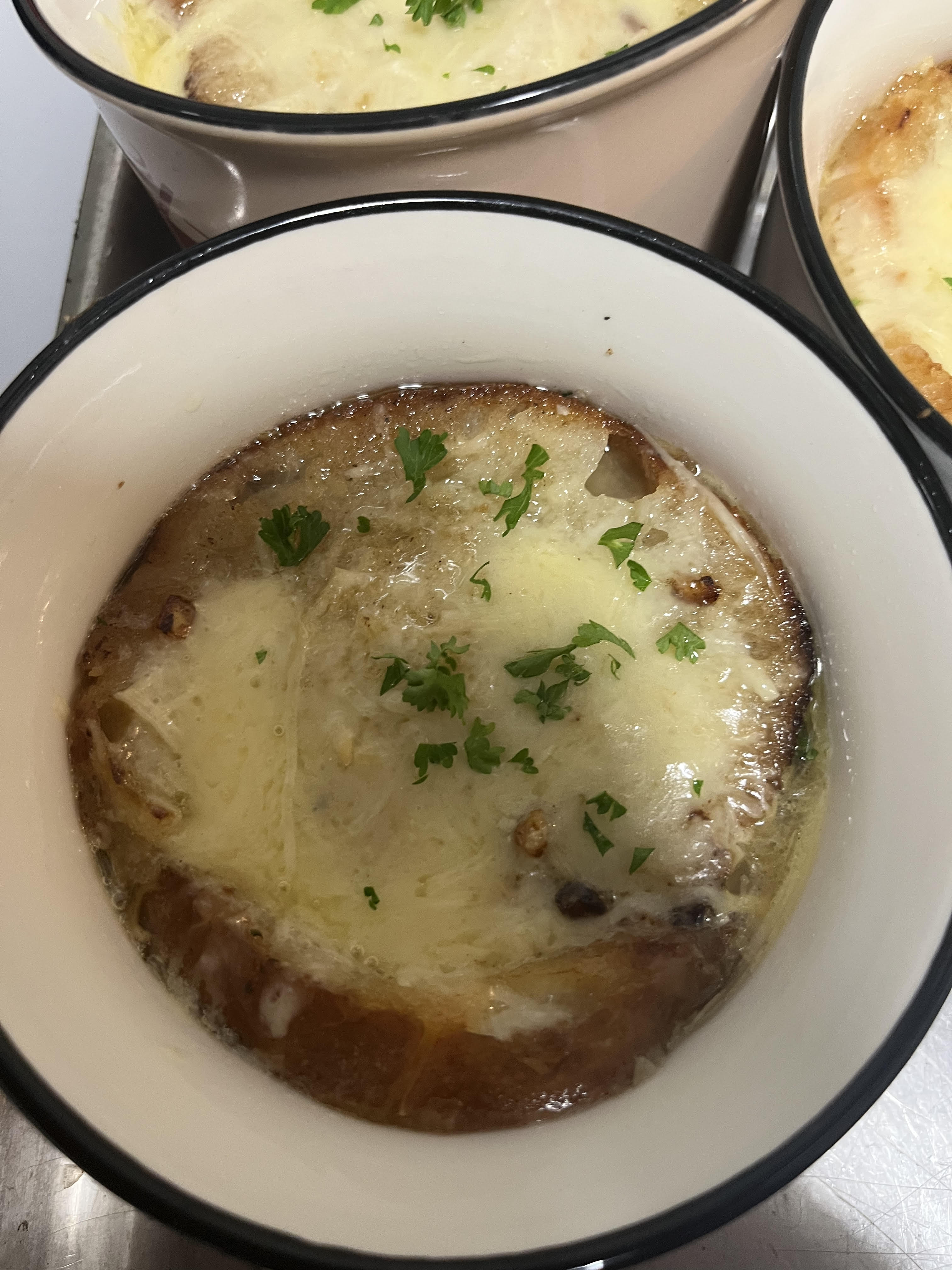 Soupe à l'oignon gratinée au Comté AOP. Possibilité de Pain Sans Gluten