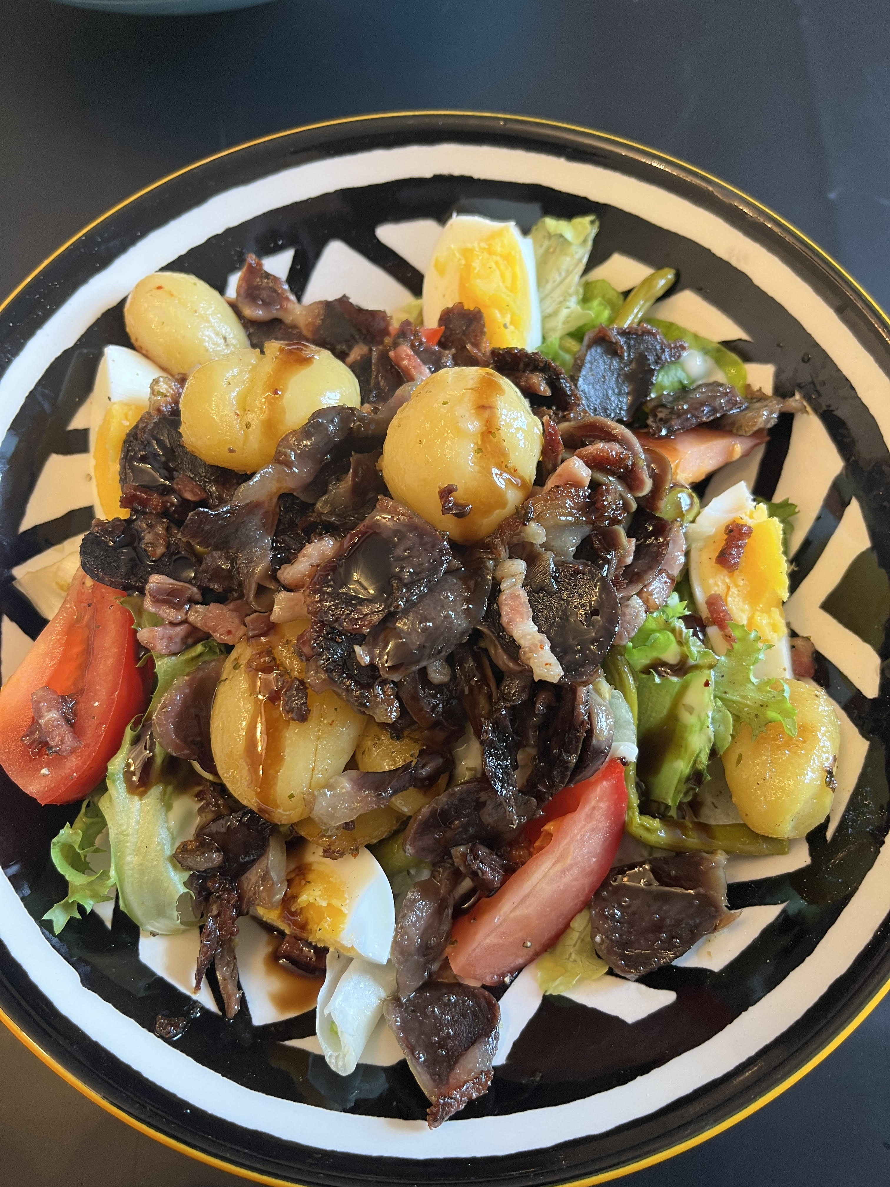 Allergens listSalade de Gésiers de canard, lardons, oeuf dur, pommes de terre, noix, salade frisée