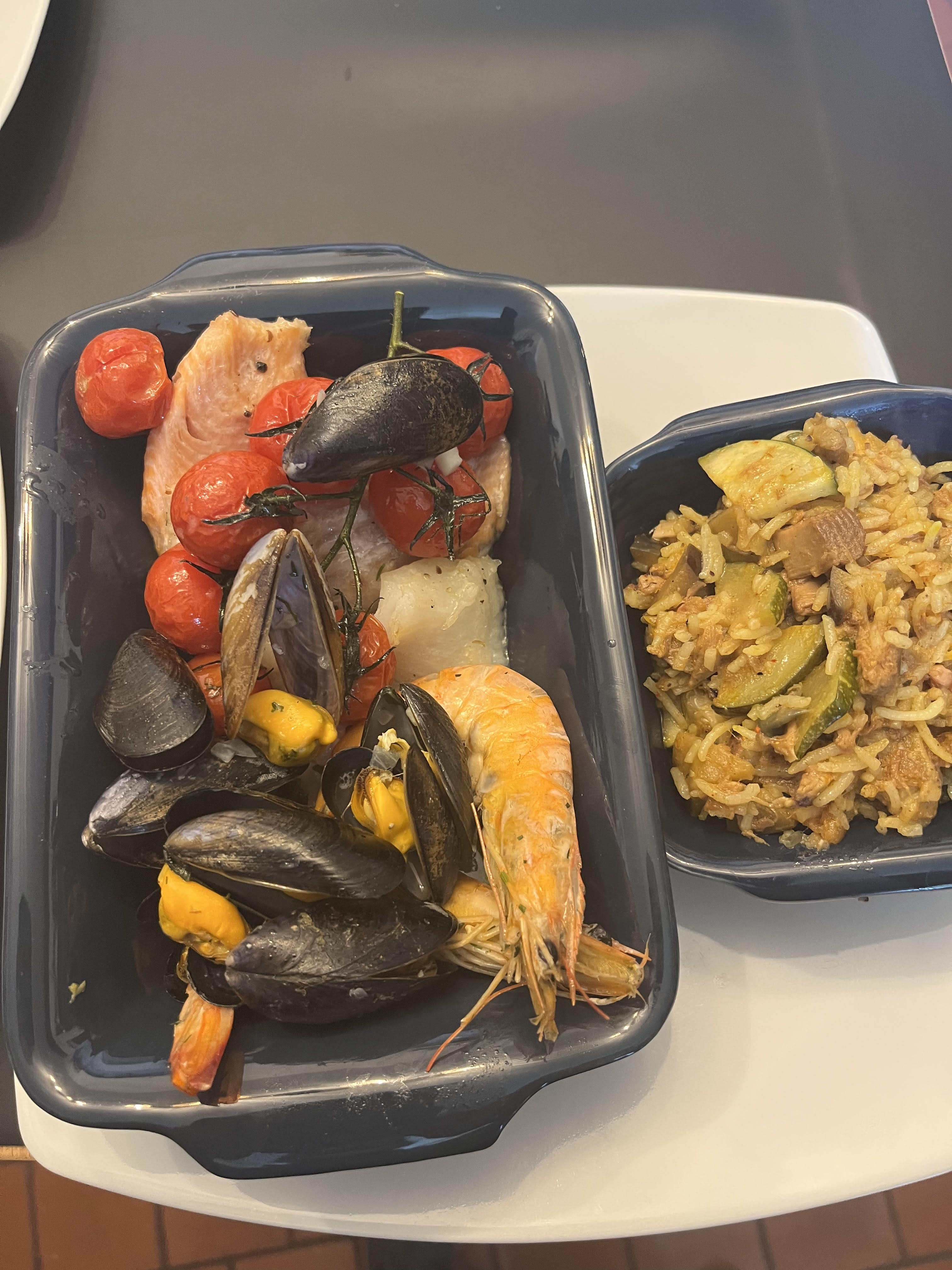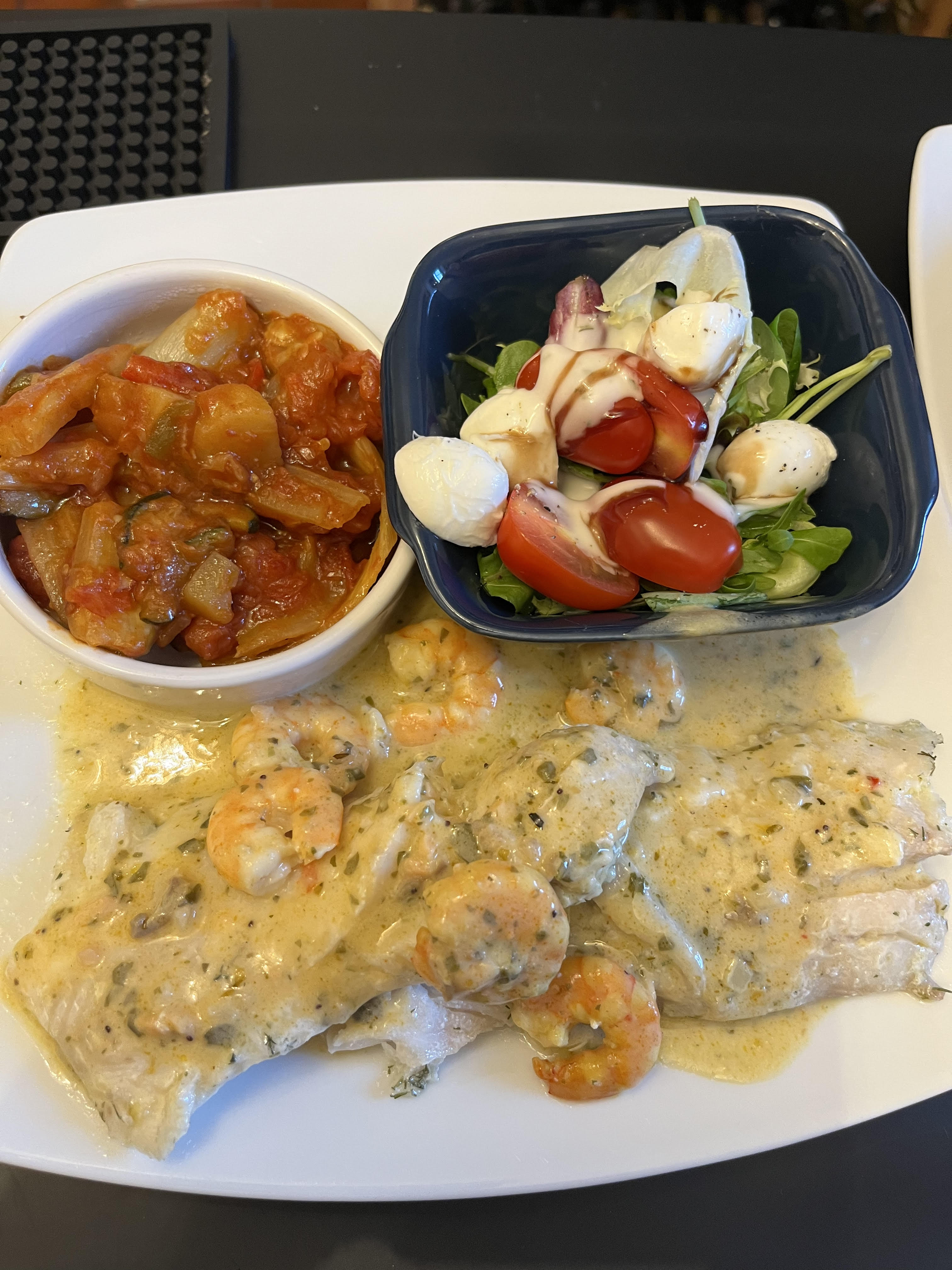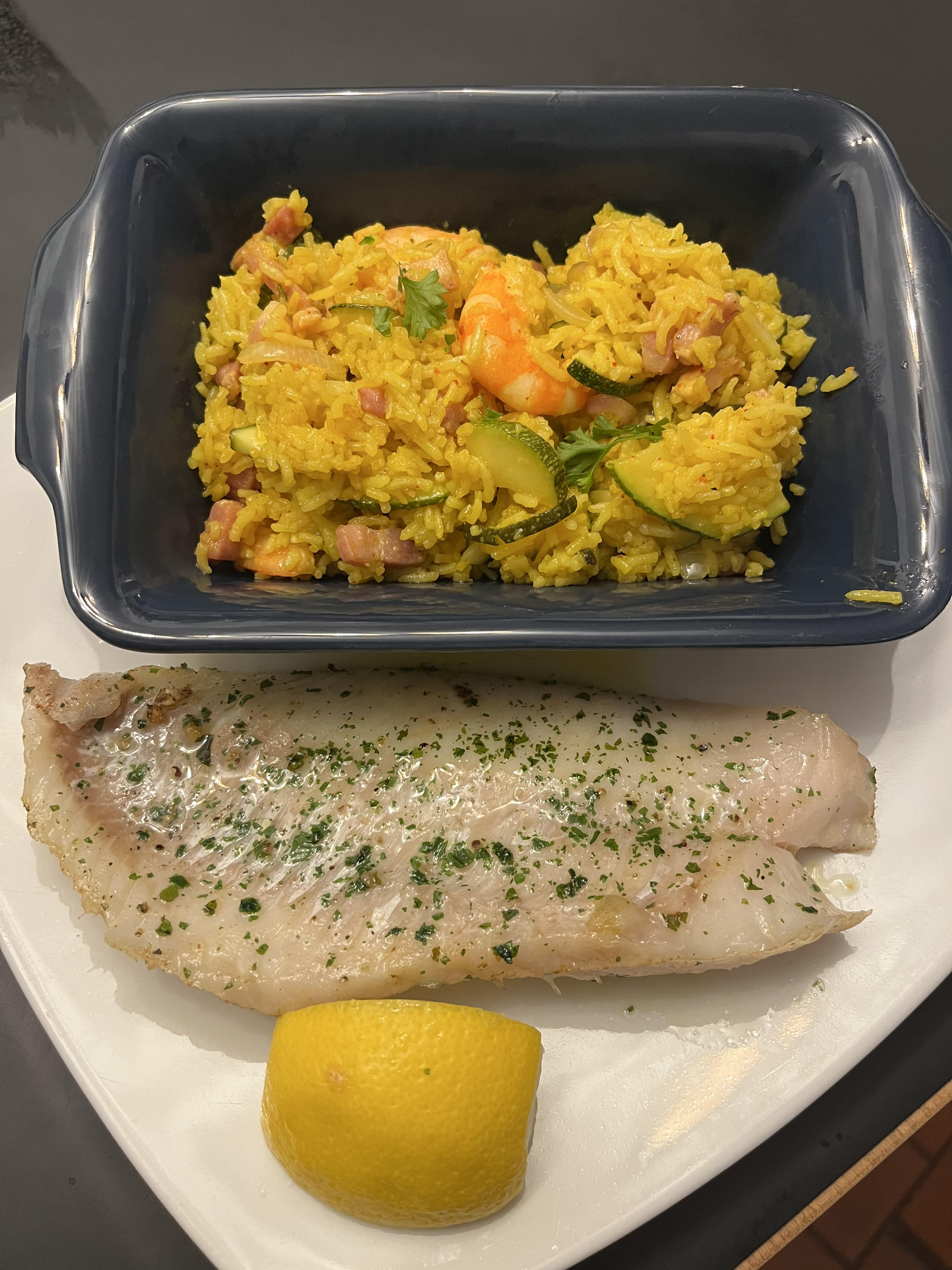Allergens listFilet de Dorade grillée sauce persillade & riz citronné courgette, lardons et crevettes